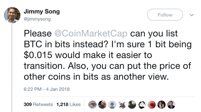 Song is convinced, however, that moving to the bits standard will make the cryptocurrency more accessible to newcomers, to whom a figure such as $17,000 can seem daunting. He’s since petitioned Coinmarketcap for their help, as Song seeks groundswell support for the move to a smaller unit of bitcoin.