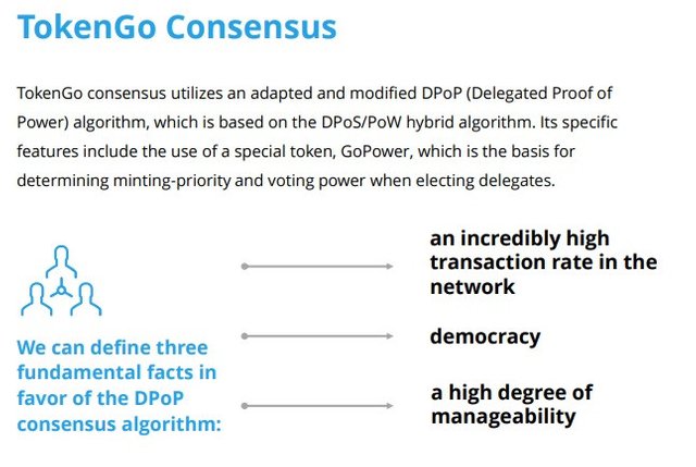 TokenGo consensus utilizes an adapted and modified DPoP (Delegated Proof of Power) algorithm, which is based on the DPoS/PoW hybrid algorithm. Its specific features include the use of a special token, GoPower, which is the basis for determining minting-priority and voting power when electing delegates. When blocks are generated, the DPoP consensus suggests that the dependence on equipment power capacity and the stake in GoPower token ownership should be used simultaneously.