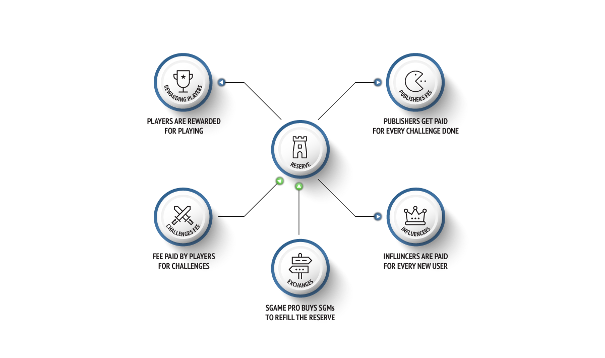 Ekonomi token SGM berpusat di sekitar sirkulasi terus menerus token antara Sgame Pro dan Ekosistem Peserta (Pemain, Penerbit, Influencer dan Pedagang) membidik token yang sangat cair.
