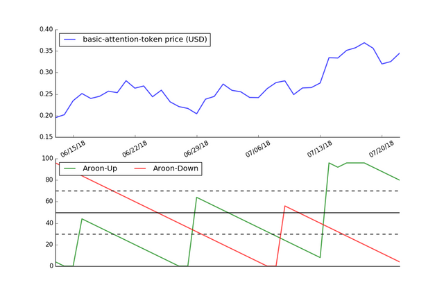The graph below shows the Aroon Indicator using the price of Basic-attention-token over the last 40 days.