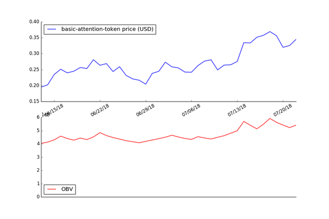 The graph below shows the OBV applied to the price of Basic-attention-token using daily price data for the last 40 days.