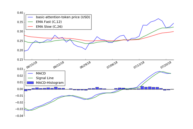 The graph below shows the MACD applied to the price of Basic-attention-token using daily price data for the last 40 days.