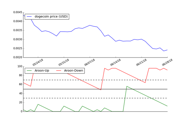 The graph below shows the Aroon Indicator using the price of Dogecoin over the last 40 days.