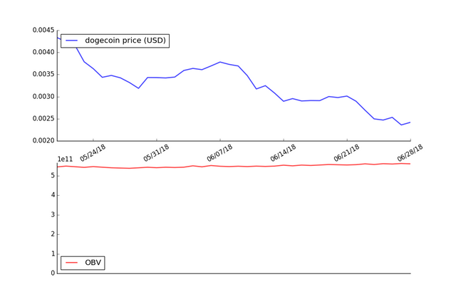 The graph below shows the OBV applied to the price of Dogecoin using daily price data for the last 40 days.