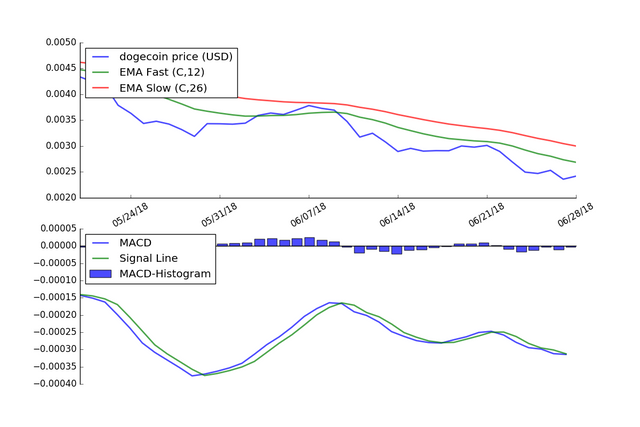 The graph below shows the MACD applied to the price of Dogecoin using daily price data for the last 40 days.