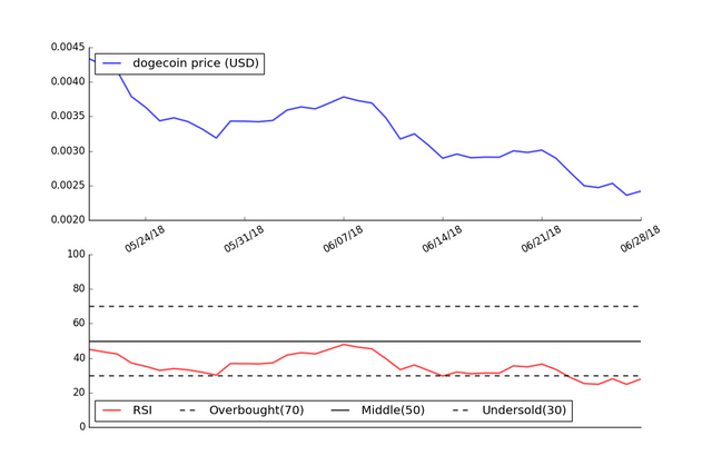 Since the RSI is currently below 30, this would indicate that Dogecoin is becoming oversold and that a price reversal to the upside is expected.