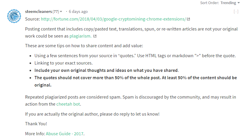 For guidance, let me snipe for you a post from @steemcleaners about such behavious as you are showing here.