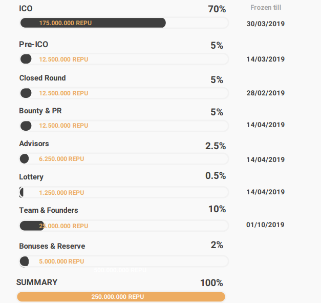 Значки REPU создаются на основе Ethereum ERC-20. На данный момент мы работаем над техническим описанием и спецификацией смарт-контрактов. Информация и открытый исходный код будут добавлены позже. Вопрос РЭП ограничивается 250 000 000 РЕП во время закрытого раунда, до ICO и ICO. Нераспределенные РЕП, выпущенные для продажи в течение закрытого раунда, до ICO и ICO, будут заморожены по интеллектуальному контракту без возможности последующего вывода или использования (фактически уничтоженного). Выпуск РЕП запрограммирован с помощью интеллектуального контракта.
