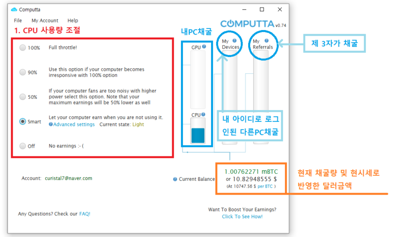 generating your money for as long as you have your computer power on.You don’t need to have any special skills. You don’t need to spend any money or time. You don’t need to do anything at all! Computta Smart Miner app will do all its work in the background when your computer is on.You can check your stats right in the application for the device you run it on. You can increase/decrease application’s power depending on how much you use your computer at the moment. You can pause the application or even switch into a Smart Mode.You can withdraw your earnings at any time from your Member Account when it hits the required withdrawal minimum. Currently we will send your earnings in Bitcoin to your Bitcoin wallet. But we also work on solutions to withdraw earnings directly in USD and at least one other alternative method to satisfy all possible needs.You can also promote Computta with our multi-tier Affiliate Program and receive commissions from your referrals 5 tiers down! This will easily 50X your passive monthly earnings!