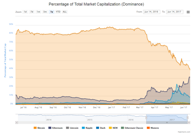 As of Wednesday, bitcoin BTCUSD, -1.50% (shown in orange on the chart) accounted for 39% of the combined market capitalization for all cryptocurrencies, down sharply from 87% on Feb. 25.