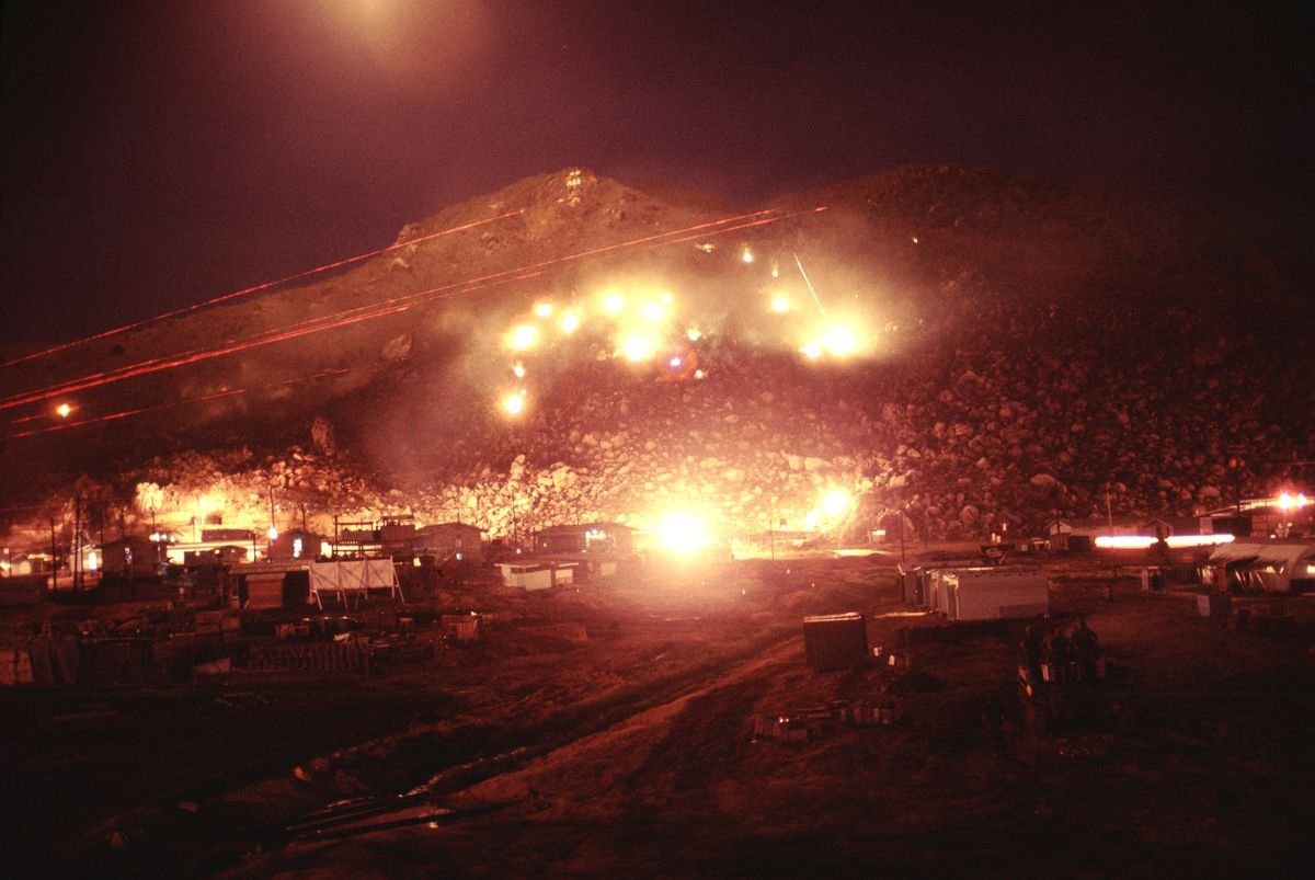 Hand-launched flares illuminate the hills as soldiers fire M60 machine guns with red tracers. One round can be seen ricocheting near the top of the mountain.