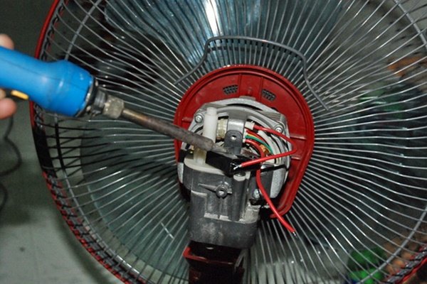 จากนั้นก็ปอกสายไฟตรงปลายเพื่อบัดกลีครับ ต้องระมัดระวังไม่ไปทำให้ส่วนอื่นๆ ของพัดลมเสียหายนะครับ เพราะขดลวด motor จะเล็กมากๆ ขาดเอาได้ง่าย จริงๆ ขั้นตอนนี้ใครไม่มี หัวแร้ง ตะกั่ว ก็สามารถใช้วิธีการพันสายไฟได้ครับ เพียงแต่ต้องพันเข้ากันให้แน่นหนาที่สุด และหลังจากนั้นต้องพันด้วยเทปพันสายไฟอีกครั้ง อันนี้จำเป็นมากๆ นะครับไม่งั้นไฟช๊อตเอาได้