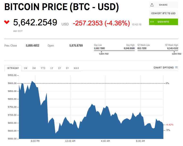 Bitcoin, the red-hot digital currency up more than 400% this year, was trading down 4.42% Wednesday morning after the blockchain network underpinning the coin split again.