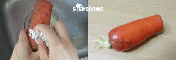 감자나 당근 등 얇은 껍질이나 흙이 묻은 야채 손질 어떻게 하시나요? 감자 깎는 칼이나 숟가락?! 그것도 좋지만 저는 종종 쿠킹 호일을 활용한답니다. 쿠킹 호일을 뭉친 다음 야채를 문질러만 주면 쉽게 깎을 수 있어요. 칼로 깎은 것 보다 훨~씬 깔끔하게 깎이고 잘려나가는 부분도 최소화 할 수 있어서 음식 낭비를 줄일 수 있어요. 감자의 눈 부분이나 우엉 같이 깊숙하고 복잡한 부분도 쿠킹 호일을 돌돌 말아서 집중적으로 쑤시거나 비비면 아주 깔끔하게 손질 할 수 있어요. 쿠킹 호일로 야채를 깔끔하고 반질반질하게 손질해 보세요.