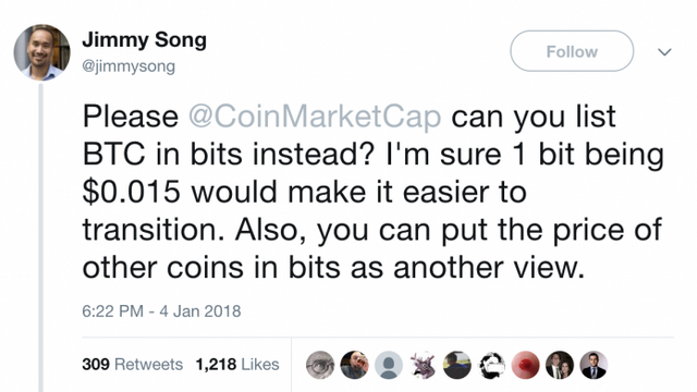 Not everyone is enamored with the idea of using bits as the default unit of bitcoin across wallets and exchanges, with some pointing out that one bit is typically what it costs to send BTC now, meaning that a single bit is essentially unspendable. Song is convinced, however, that moving to the bits standard will make the cryptocurrency more accessible to newcomers, to whom a figure such as $17,000 can seem daunting. He’s since petitioned Coinmarketcap for their help, as Song seeks groundswell support for the move to a smaller unit of bitcoin.