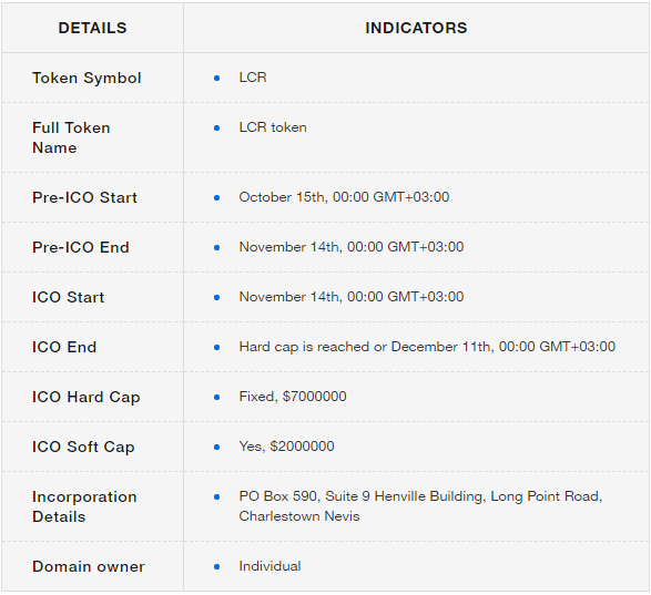 Maximum Raise: $7 000 000 USD or 10 000 000 LCR Tokens (whichever happens earlier)