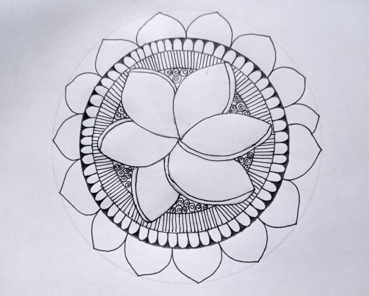 কাঠগোলাপ ফুলকে কেন্দ্র করে চমৎকার একটি ম্যান্ডেলা এঁকেছেন আপু। পেন্সিল দিয়ে সাদা কাগজের ওপর ফুল একে মাঝে হলুদ রং দেওয়ার কারনে দেখতে সুন্দর লাগছে। ধন্যবাদ আপনাকে আপু