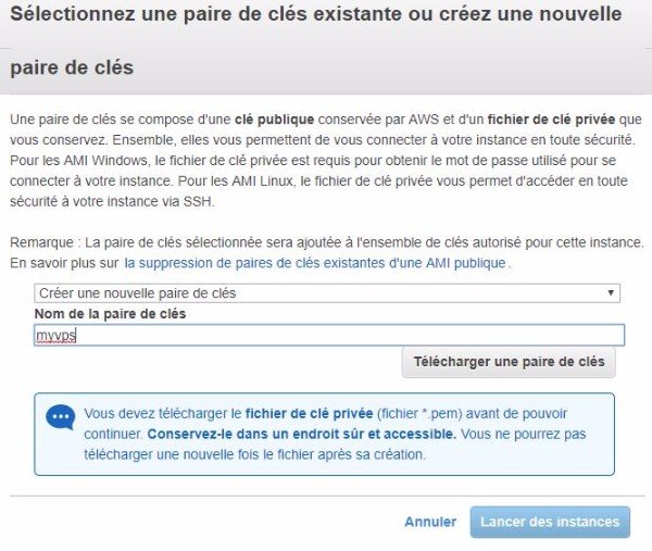 Here we choose a name for the file that will have the login information for this vps and then press Telecharger une paire de cles and then Lancer des instances and then press Afficher les instances