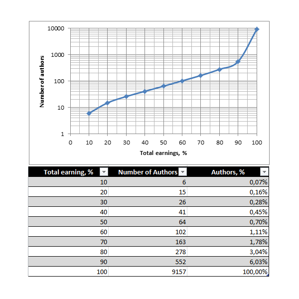 As you can see, 90% of total posts value is earned by only 6% of Steem authors.