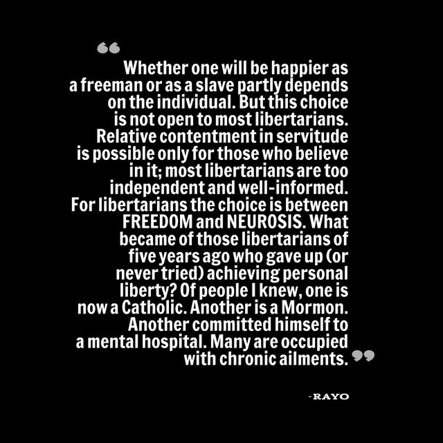 "Whether one will be happier as a freeman or as a slave partly depends on the individual. But this choice is not open to most libertarians. Relative contentment in servitude is possible only for those who believe in it; most libertarians are too independent and well-informed. For libertarians the choice is between freedom and neurosis." [Emphasis added]