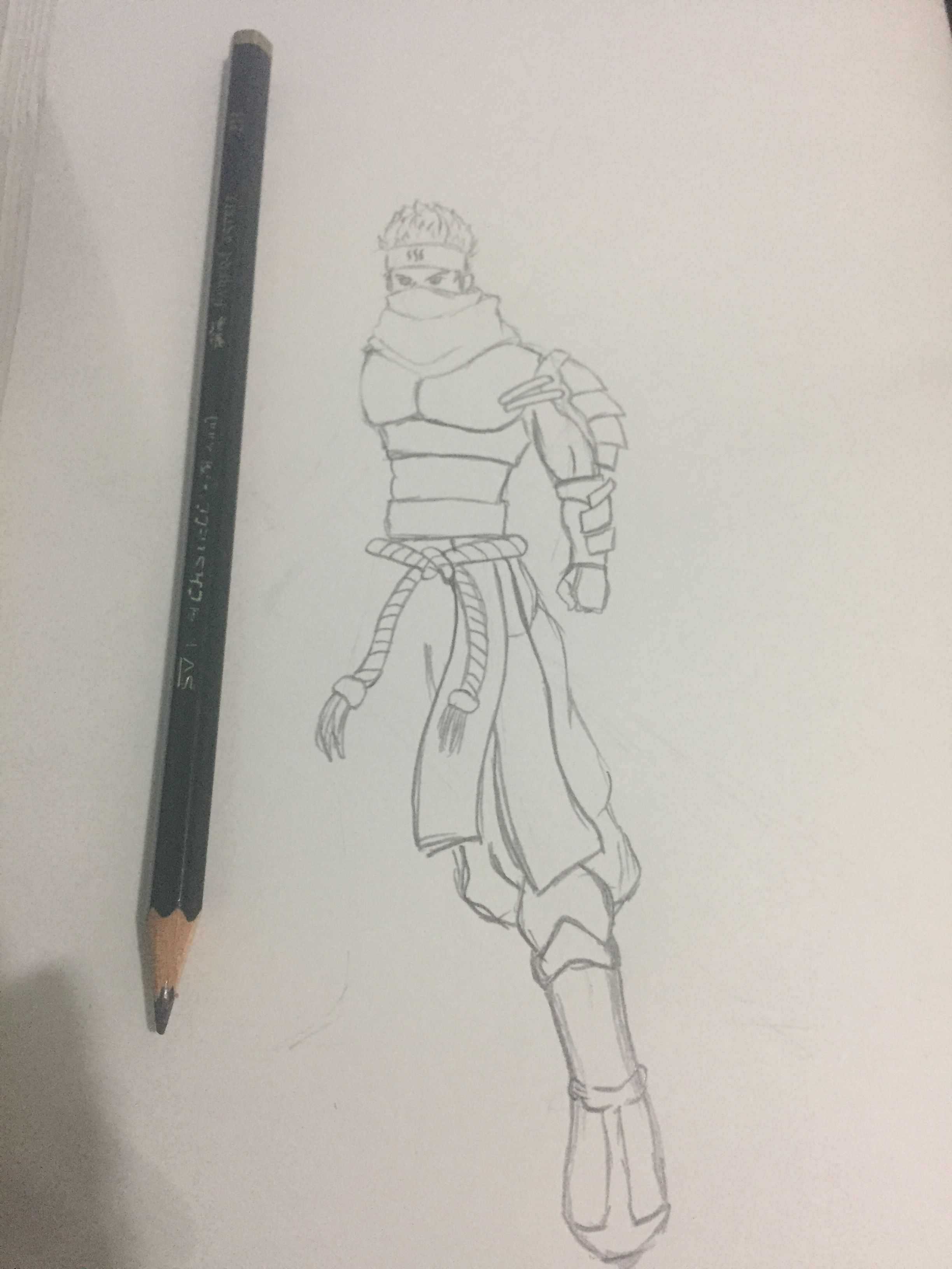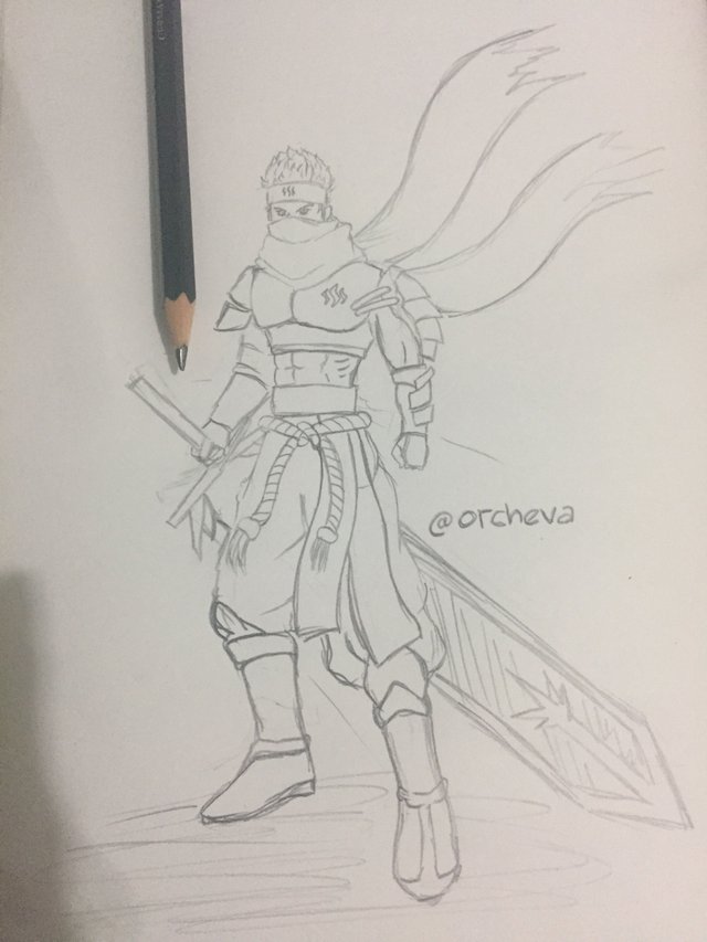 The making step is, I drew the base with a pencil with my own imagination of a shinobi that uses a sword. Here's the basic picture: