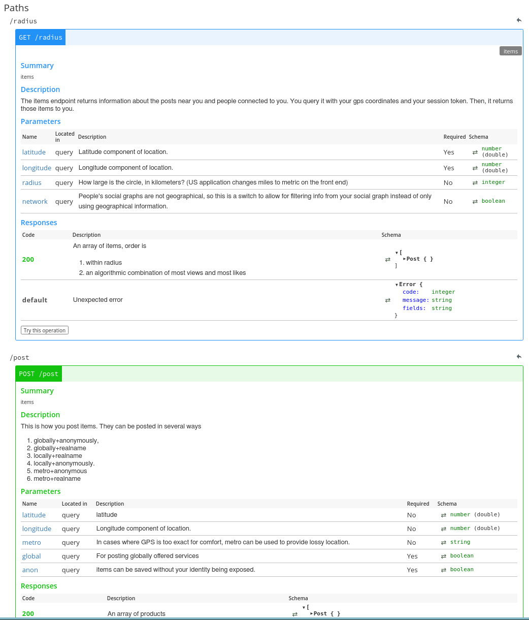 It is a specification for a Swagger API that I'd like feedback on. On the left hand side there is YAML code that defines the spec, and on the right hand side is a visualization of the spec.