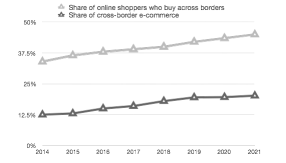 According to the Whitepaper: While domestic online sales are growing in almost every country, cross-border e-commerce will have the most explosive growth and the Asia Pacific region will lead the way. Forrester forecasts cross-border e-commerce outpacing domestic growth with a compound annual growth rate of 17% between 2017 and 2022, compared with 12% for overall B2C e-commerce.