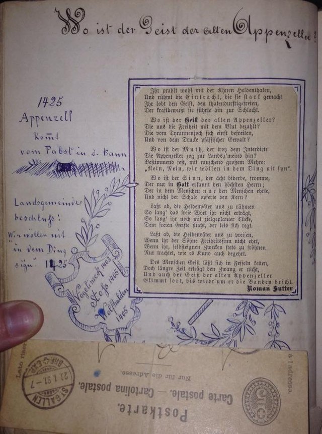 Above is a picture of a dispensation. The Sutter castle was given in part to the canton of Appenzell with this dispensation. 33% would be provided to the canton while the other 67% was ownership of the Sutter family. The initiative created legislation that allowed the Sutter family to live in the property tax free. The Canton is the second smallest in Switzerland. It's also the most wealthy canton. The "Schloss" construction is an engineering wonder of mid-evil times. The spiral staircase is a first of it's kind connecting every step with a singular center post.