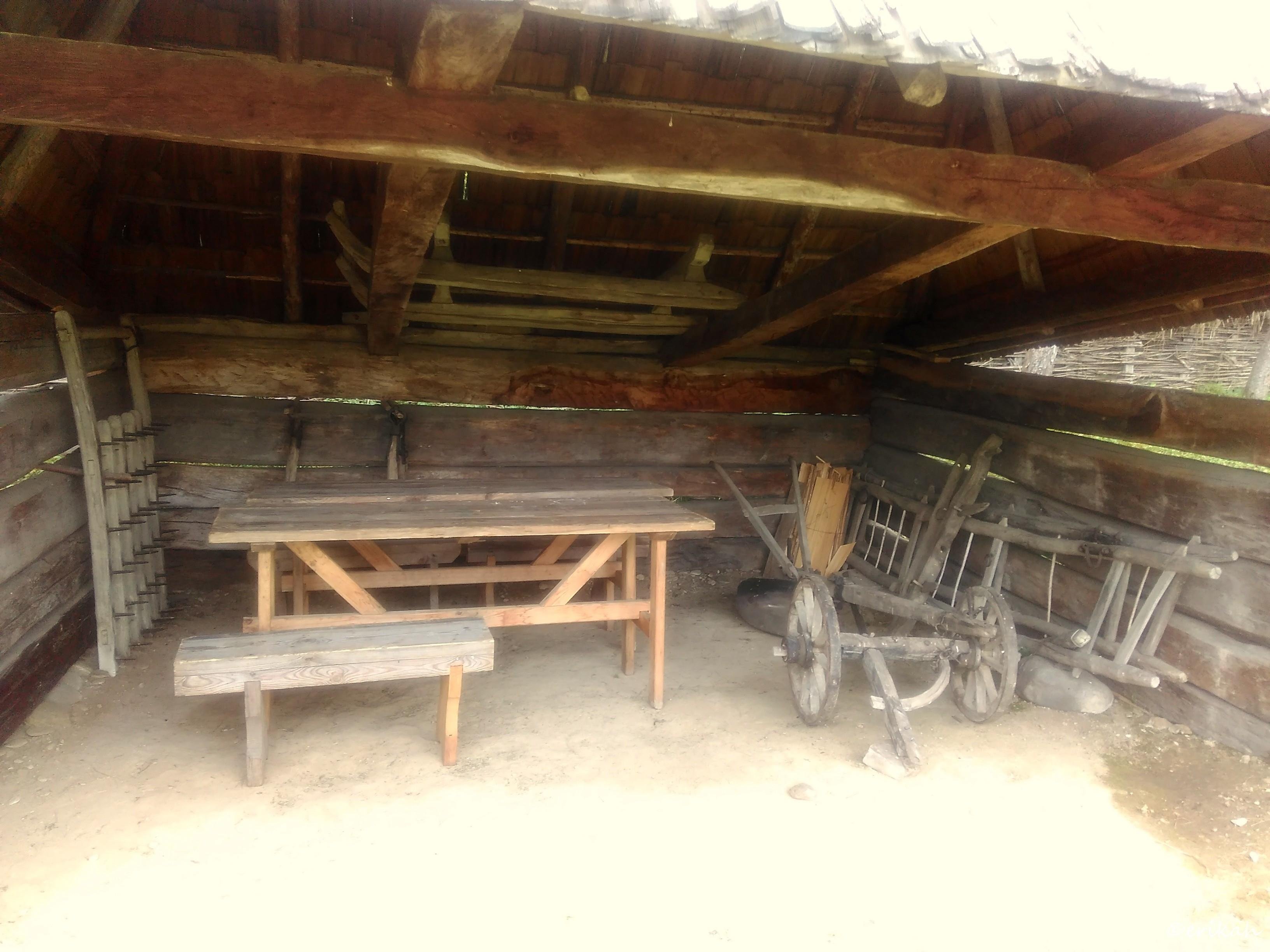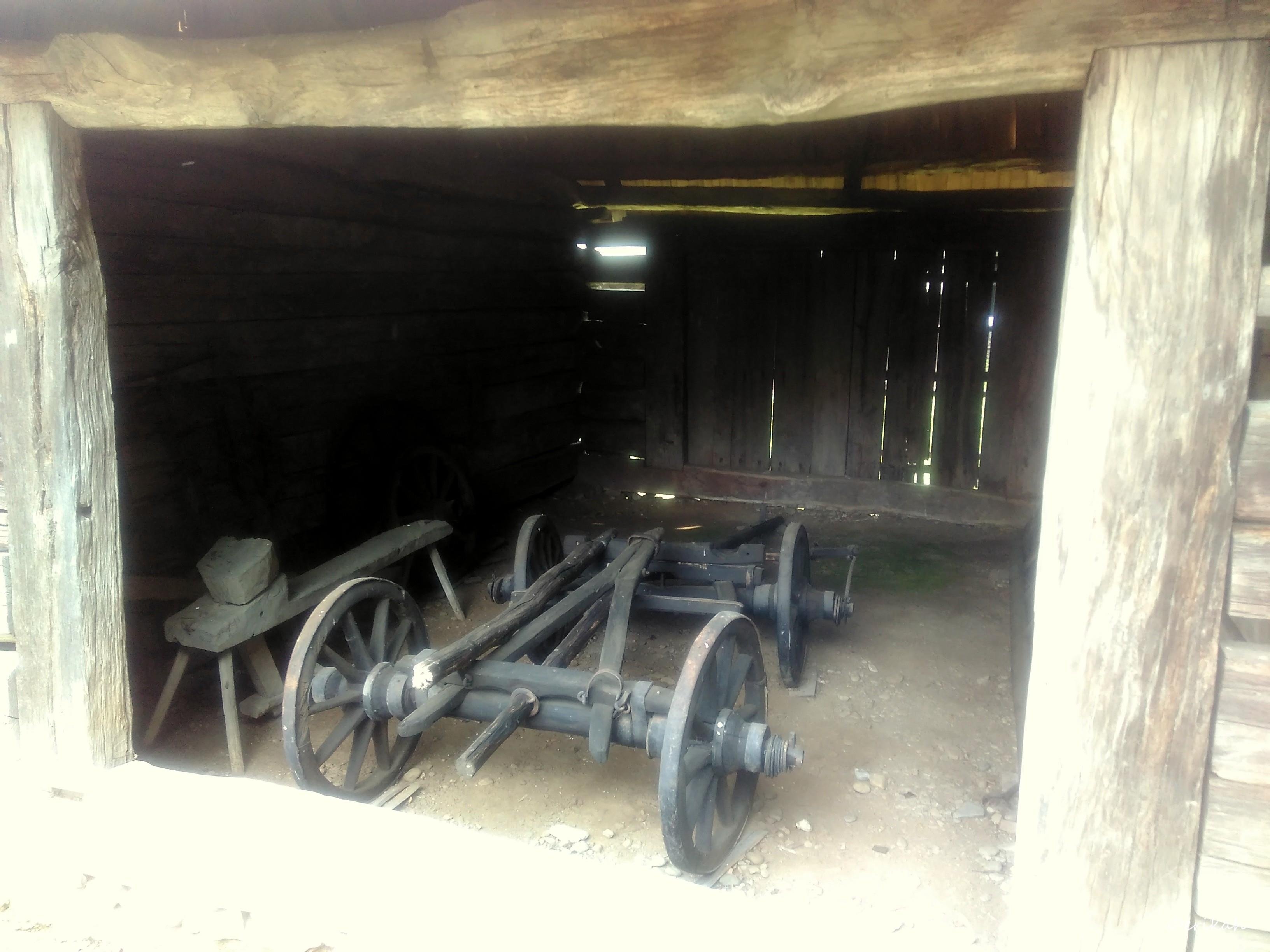 The storage space nest to the house where you can see the lower part of the chariot. These chariots were pulled by animals, usually horses, donkeys or cows in some cases.