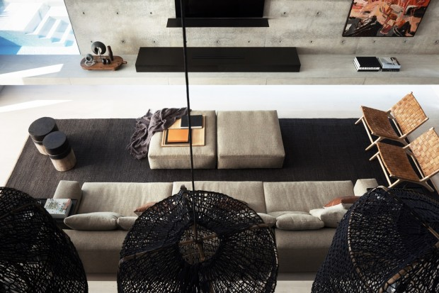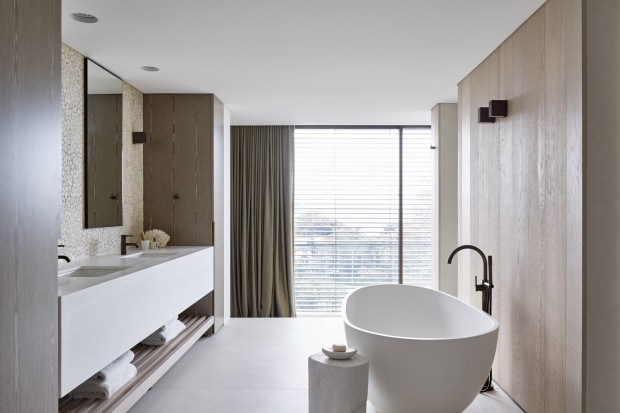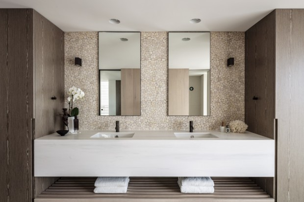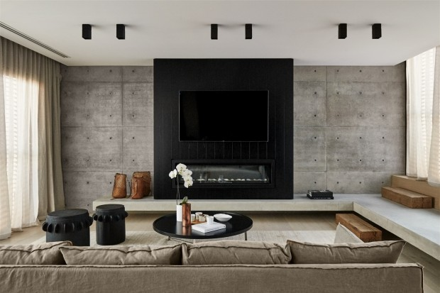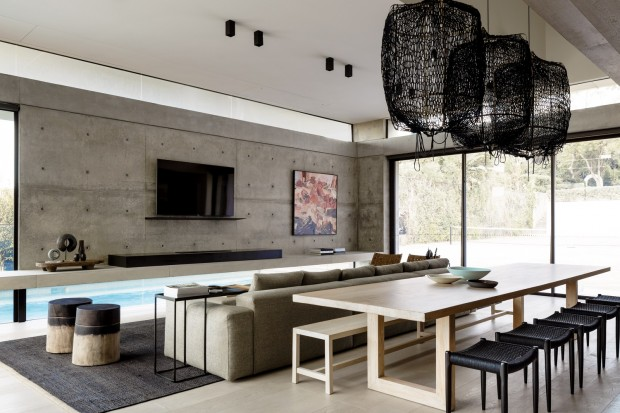 The ground floor hosts a mix of formal and informal pieces on different levels and a large covered outdoor terrace by the pool. The first floor hosts the parents' bedroom enjoying the north aspect and views, with the children's rooms located on the top floor. The existing tennis pavilion has been transformed into a guest house with a new level added to house a gym. To accentuate the meaning of seamless spaces, the architectural material palette consists of dark metal, wood, stone and concrete.