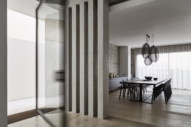 The project was conceived as a group of two pavilions arranged around a central courtyard where spaces can circulate freely from the inside to the outside, allowing the two pavilions to access the light. The house is located as close as possible to the western limit, away from the neighboring property for solar gain and a more panoramic view. The narrow entrance to the site has been widened by cutting existing sandstone boulders to introduce a generous staircase nestled along the rock face. The wide, cantilevered concrete steps follow the shape of the rock and lead to the front door.