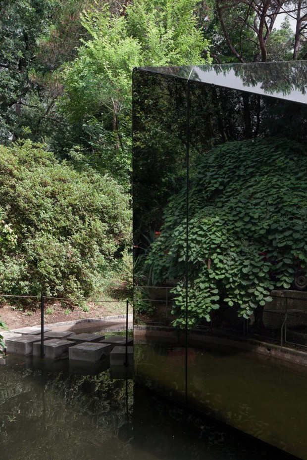 The architects were inspired by the museum created by Alvaro Siza Vieira to create this polygonal structure. The shape corresponds to the layout of the museum and its characteristic bow windows, the hexagonal pattern is repeated throughout the museum and the surrounding park. The depA architects explain: "The extracted polygon, once implanted in the park and modified in its original context, including the transformation of its form and materiality, becomes something new and detached from its original source. The pavilion is thus connected to the site through an understanding of space as opposed to a pursuit of aesthetics. While the mirrored exterior is disorienting - seeming to be confused with its surroundings - the interior of the space retains the necessary neutrality for a white cube space.