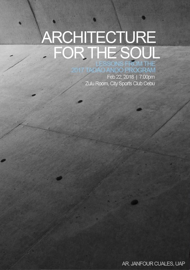 Two weeks ago, we had this mini lecture about Architecture for the Soul. It was presented by a Filipino architect who was given an opportunity to partake in an exchange program to see and learn about Tadao Ando's projects and design principles. For those who aren't aware who he is, Tadao Ando is a self-taught Japanese architect and a winner of the Pritzker Prize (considered as the Nobel Prize for architects).*