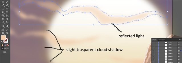 Now Add your light to the cloud outline you drew earlier using the same pen tool. apply transparency and feather effect to the light to add some depth to your illustration.