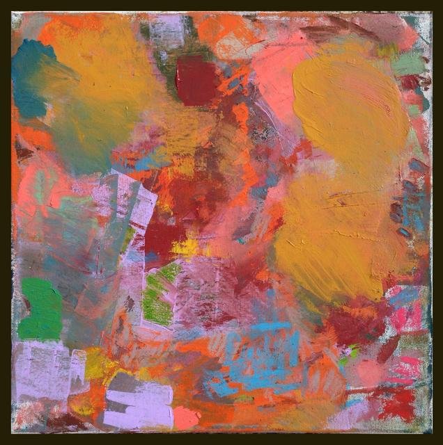 i like the day-glow salmon color in the painting. and that bright blue and the green dot.