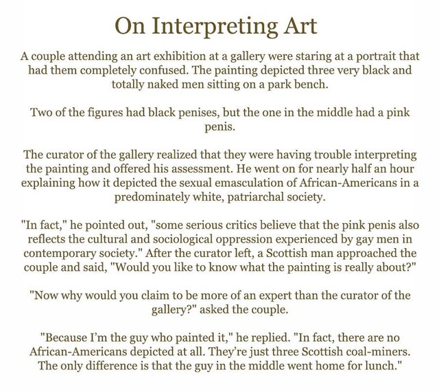 I enjoy reading interpretation of my artworks. There are times, though, when I still can't help but think of the following joke: