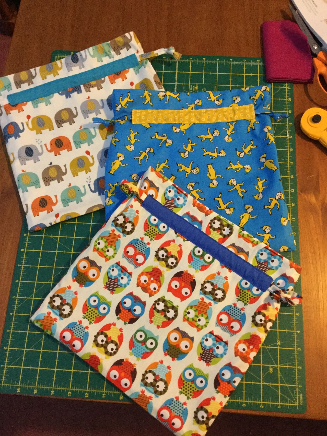 I love the elephant fabric and your use of that fabric for the drawstrings. Very cute. What a great and simple idea for supply organization!