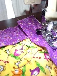 I forgot to include the first step which is to cut all the batting and extra fabric off the edges. This is called squaring the quilt. I then needed to cut the strips of fabric to the right length. I made them 2.5 inches wide and cut 6 of them. I use my rotary cutter and handy cutting tool and it's pretty quick! I then sew all of the strips together to make one long strip. The strips line up at a 90 degree angle and are sewn diagonally from corner to corner. The extra fabric on the corners is then trimmed off.