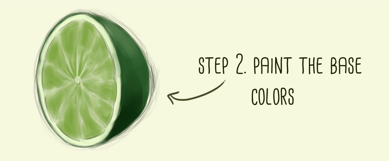 Make a new layer below the sketch layer and start adding the base tones. I prefer starting out with a dark tone, adding the lights later. Painting a lime I use mostly greens and yellows and perhaps some blues. You can use any brush you like for this.