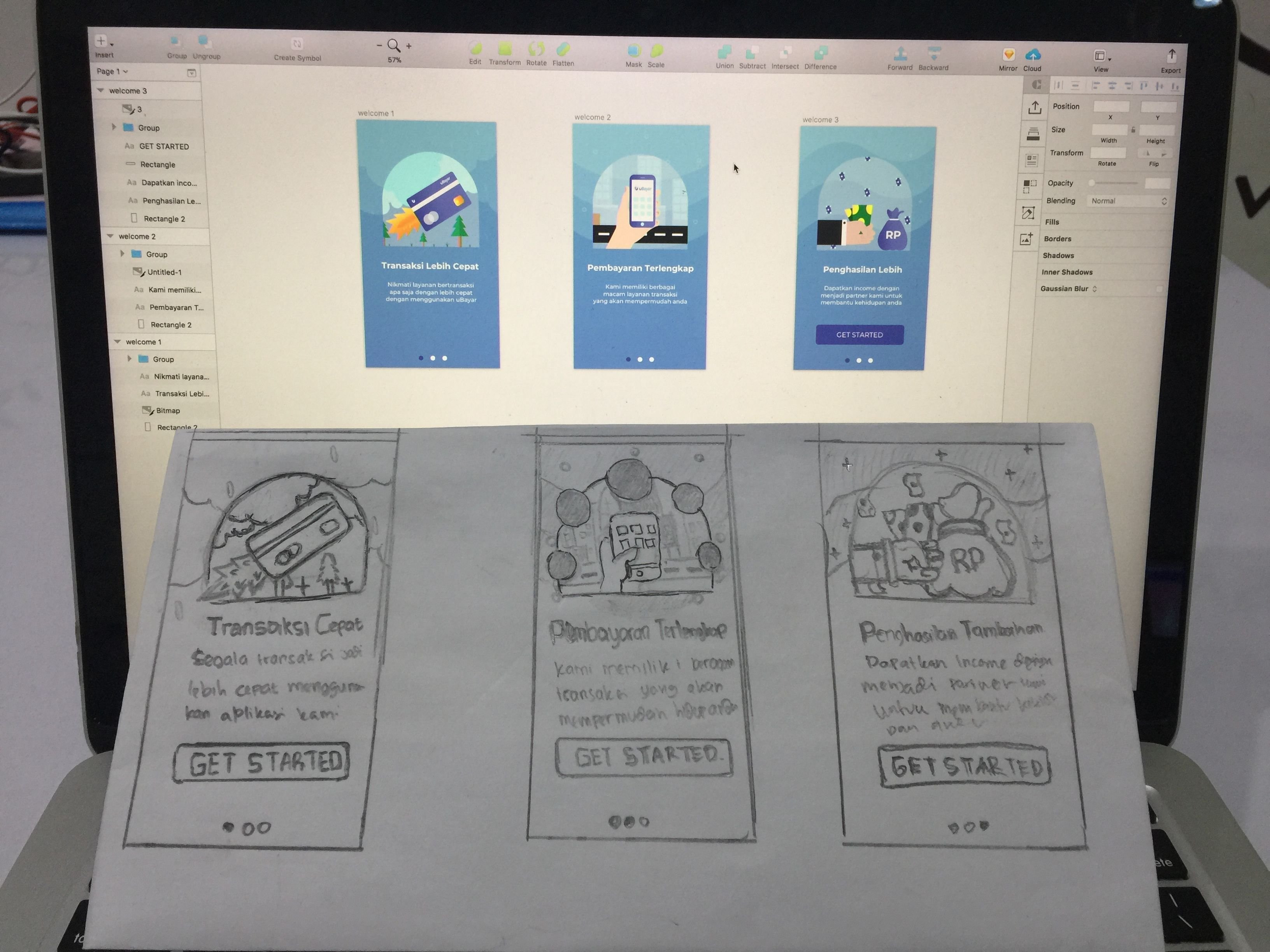 Sesuai yang biasa dilakukan oleh kebanyakan designer, pross design selalu dimulai oleh corat-coret , atau mengkonsep bentuk kasar dari sebuah design. Ada 3 bagian welcome screen yang saya buat, dan masing-masing bagian menyampaikan pesan tersendiri dari keunggulan aplikasi tersebut, berikut penjelasannya :