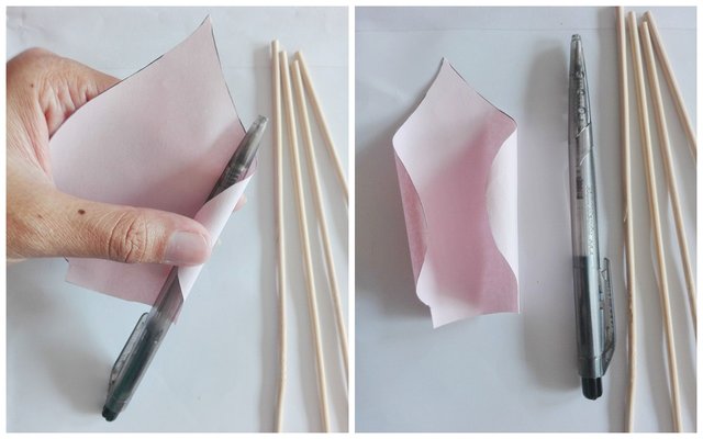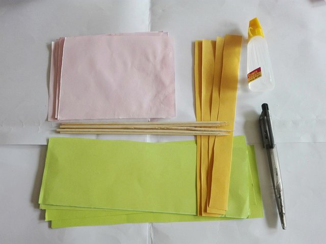 We need colored papers--four 8.1" x 3. 9'' sheets of green, four 4.12" x 5.8'' sheets of pink, and four 1.8'' x 11.29'' of yellow. We also need scissors, glue, wooden barbecue sticks, and a pen.