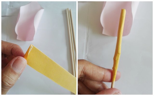 Glue the petals onto the barbecue sticks, one at the base of each yellow cadix. Wrap the petals around and glue like above.