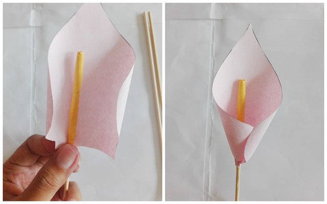 For the yellow spadices, wrap (and glue) a yellow strip of paper about 2 to 3 inches or so onto each barbecue stick.