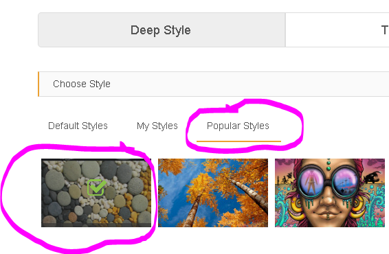 Your final option for selecting a style is to choose from style images that are popular with other users of the Deep Dream Generator. Click on the "Popular Styles" option and then select from the style choices. These will not have names so you just have to look at the thumbnails. Again, the green check mark indicates the currently selected style:
