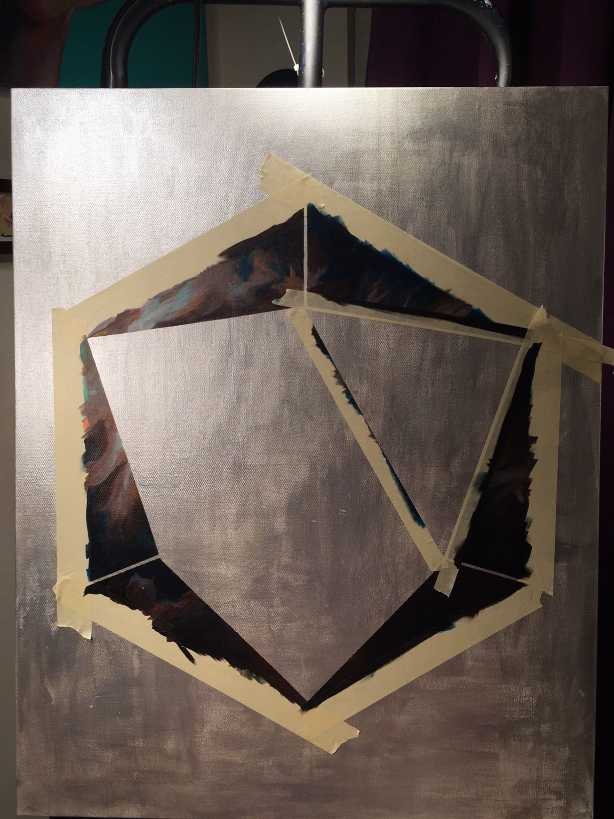 One of the techniques that I used and explored in multiple ways creating this series involved masking tape and numbers. I love that painting is like a puzzle, and I think it's fun to try to find an efficient route to achieve my vision. I created my reference in PhotoShop using NASA's image of 30 Doradus or the Tarantula Nebula. I placed it within an icosahedron, a shape familiar to many gamers. I was exploring more complex geometry after playing with stripes, circles, and triangles.