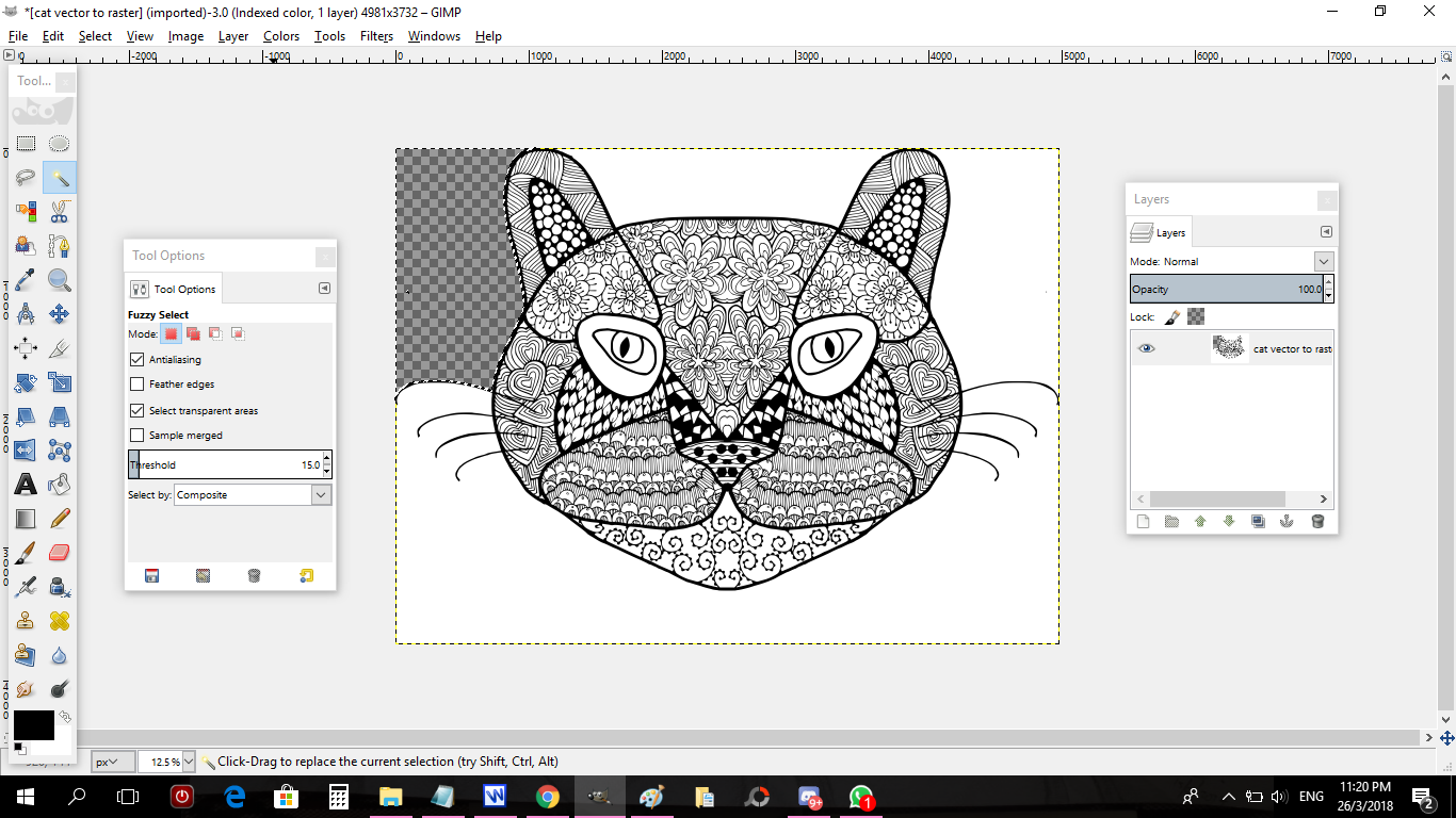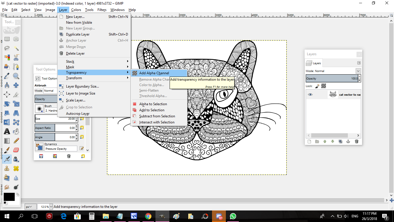 Open that PNG file in GIMP. One of Redbubble's (and majority of the POD sites) requirements is to use transparent PNG images. Transparent PNG means you need to remove the image background. In this case, we need to remove the white background in the image. So how do I do this? Easy. We use GIMP's Alpha Channel.
