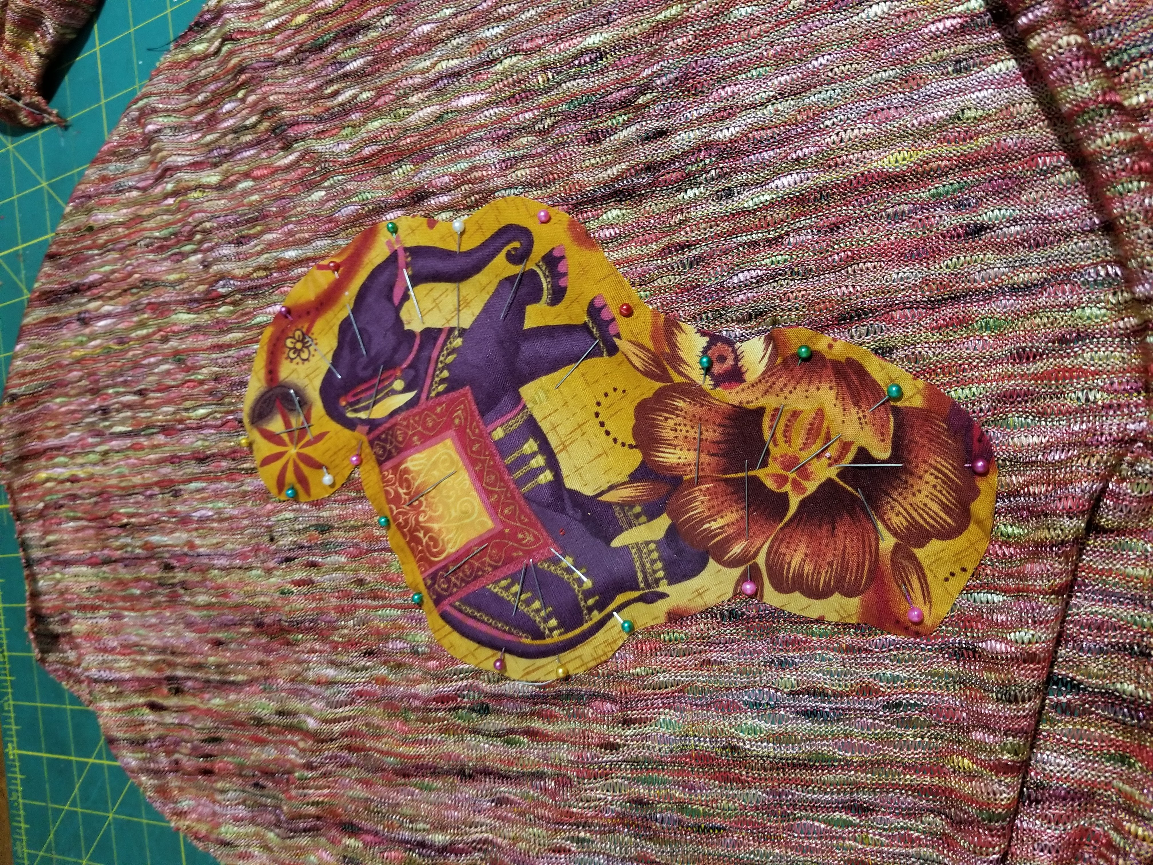Never content to churn out a basic garment, I searched my fabric stash and retrieved this bit of 1999 "Shiva" artist's cotton to use for an applique, as well as for the facings.