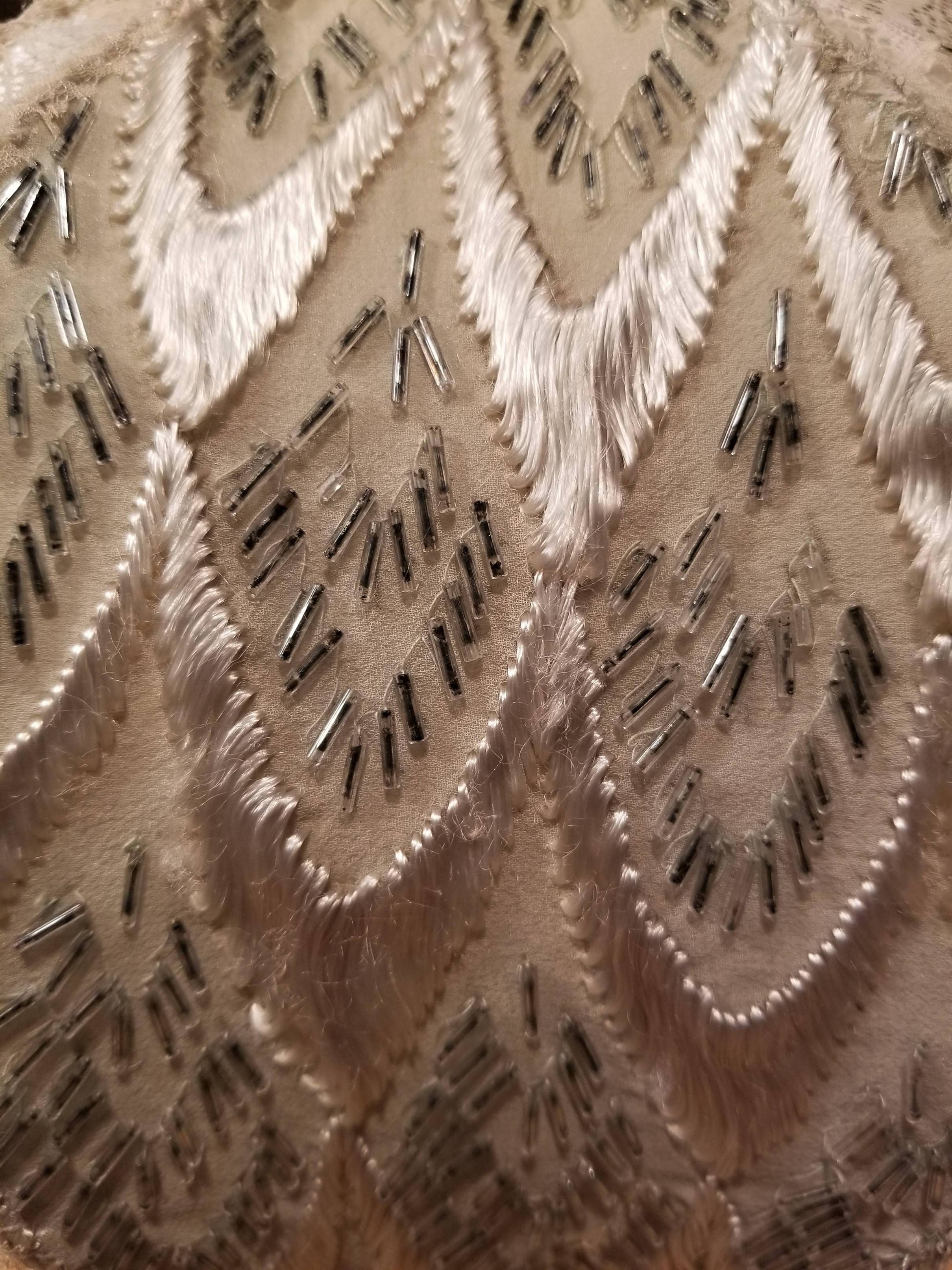 For the underlayment I decided to use a white silk charmeuse. In this photo, you can see the process of sewing the silk onto the frame atop the lining. I just adore the soft sheen of this beautiful silk.