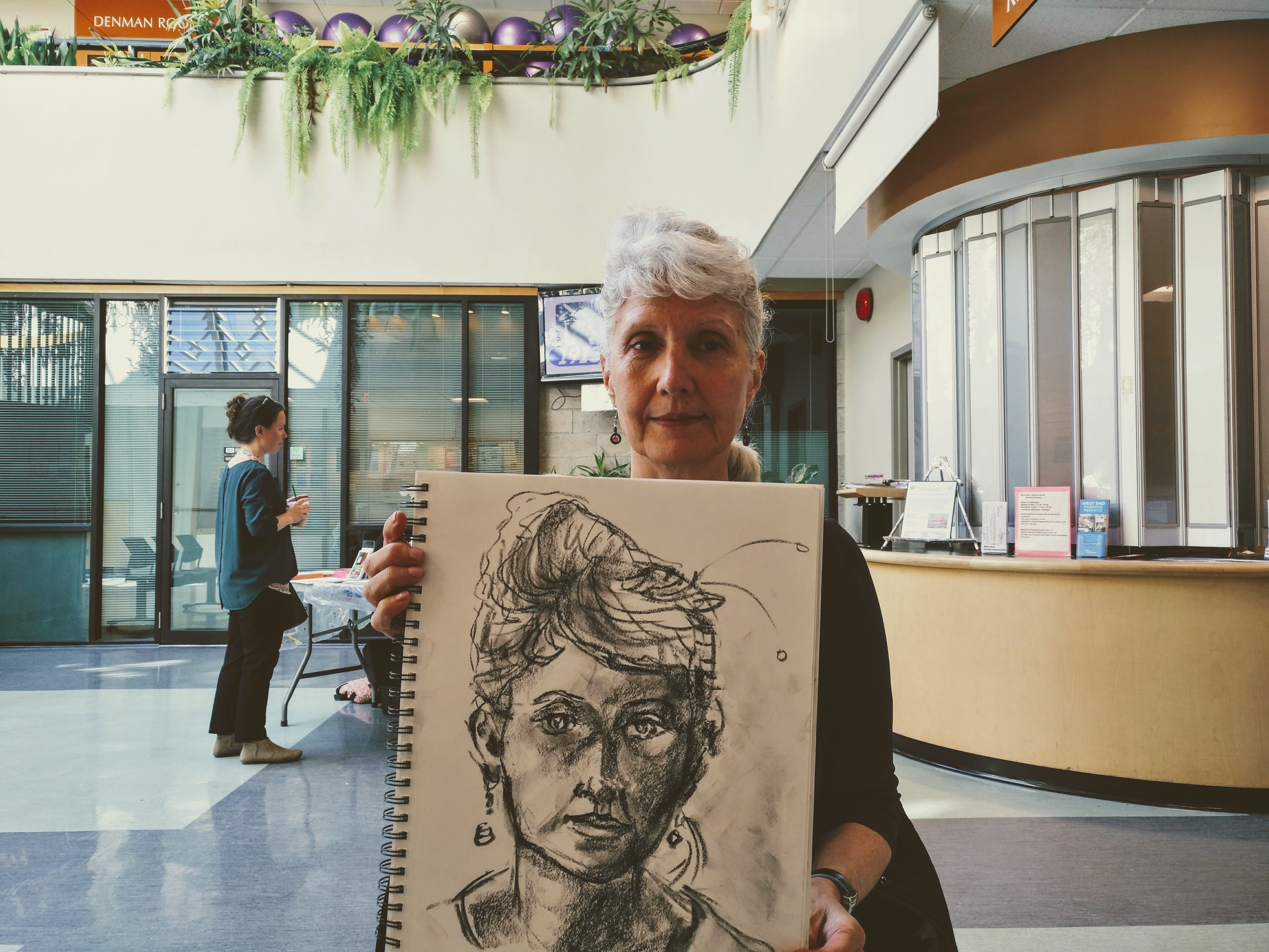 Yesterday for Art in the City, I was offering free portraits in order to promote the 2 art classes I teach there. My station was in the lobby which greatly helped attract some traffic my way. It took 15 minutes for me to get a subject but then I was booked the whole way through. It is so fun to interact with a model who is sitting and getting their portrait done. A truly intimate rapport is established, one that you don’t find anywhere else. It is in fact something of a therapy. My friend Grace Fournier was my muse and mentor since she gave me the idea to do this months ago when she was offering 5 minute portraits for her art opening. She was completely relaxed, drawing from instinct and smudging them at the end to blen in an expressive way. She let me take over that night and I was channeling what I had learned there yesterday.