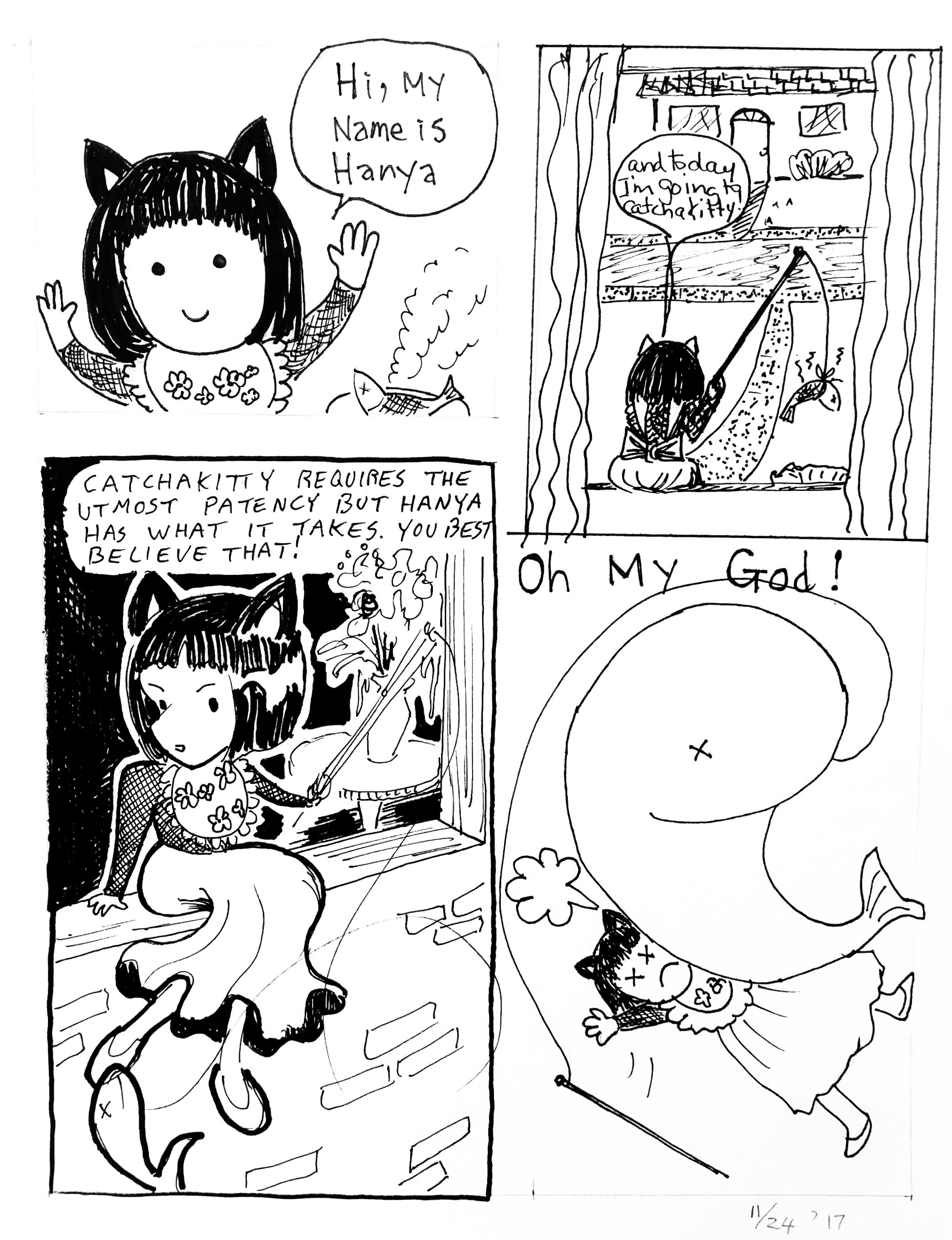 The Adventures of Hanya was created during a comic jam I held for one of my Sketching and Drawing classes. It is a type of comic book improv where you can either start a page or pick one from the pile to continue the comics. Mariko started and finished the page. I did the third panel so I am proud of my contribution to her Autobiographical journey as a Canadian citizen originally from Japan. Her granddaughter served as inspiration for the character of Hanya.